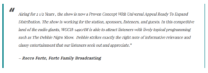 Debbie Nigro delusionally insists she is Still A Babe and takes her listeners on a wild ride through daily news & relevant content with an attitude that is positively infectious. No One Sees the Glass of Cabernet Half Full Like Debbie!